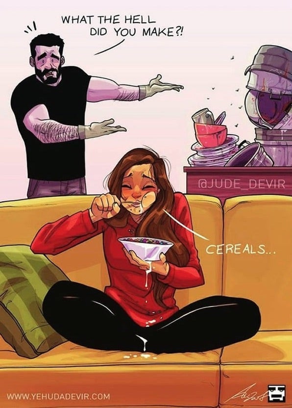 La convivencia con tu pareja es el arte de sobrevivir al día a día con amor. Una realidad bipolar en la que se puede pasar de la perfecta armonía a la discusión más incendiaria y de vuelta a la paz en 24 horas. Precisamente por eso, por la infinita variedad de situaciones que se dan en la rutina de las parejas ya sean casadas o ‘arrejuntadas’, el ilustrador israelí, la rutina de las parejas , ha querido dedicar una serie entera llamada ‘One of Those Days’ ‘Uno de esos días’, en castellano a sus aventuras domésticas con su esposa, Maya.