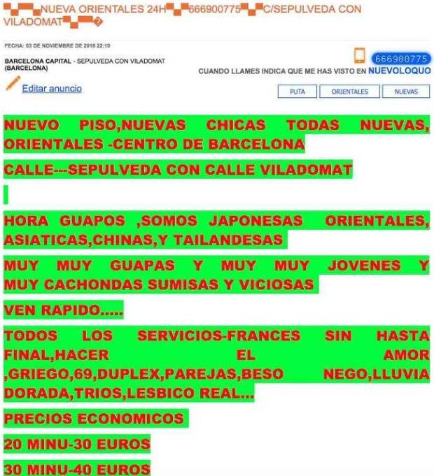 Un botón rojo pintado con spray en el telefonillo y un letrero de “no queremos un prostíbulo en el edificio” en el portal me advierten de lo que estoy a punto de presenciar: uno de los puticlubs más cutres y surrealistas de Barcelona. Desde que unos ciudadanos chinos alquilaron la vivienda para montar un burdel hace dos años, los vecinos del número 104 de la calle Sepúlveda han vivido rodeados de puteros las 24 horas del día. Por allí pasan abueletes, universitarios, currelas y hasta tíos trajeados. Un ‘no parar’ motivado por los precios ‘low cost’ de las cinco prostitutas chinas que no salen del piso ni para fumarse un cigarro: 30 euros por un polvo de 20 minutos, 40 euros la media hora y 60 euros la hora entera segúnrodeados de puteros. Una ‘obra maestra’ del marketing que incluye frases como: "muy, muy guapas y muy muy jóvenes y muy cachondas, sumisas y viciosas. Ven rápido".